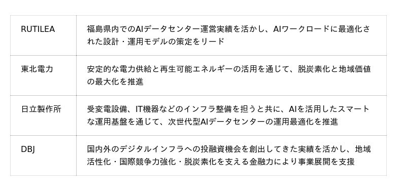 株式会社RUTILEA(以下、RUTILEA)、東北電力株式会社(以下、東北電力)、株式会社日立製作所(以下、日立製作所)、株式会社日本政策投資銀行(以下、DBJ)の4社は、AIの急速な普及に伴い高まるGPU計算需要に対応するため、次世代型AIデータセンターの構築に向けて、データセンター事業主体の組成を含めた検討を共同で開始しました。