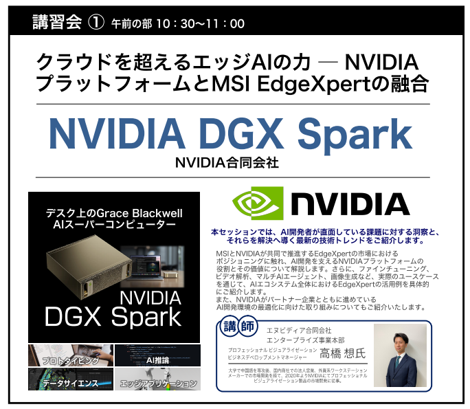 「クラウドを超えるエッジAIの力」をテーマに、NVIDIA合同会社、MSIコンピュータージャパン株式会社、の2社が登壇。 AI開発者が直面する課題を解決へ導く最新技術トレンドや、NVIDIA Blackwell GPUとGrace CPUを搭載したコンパクトなAIスーパーコンピューター「EdgeXpert」について解説など、ビジネスの課題を解決するセッションを実施します。