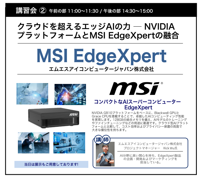 【内容】: (午前11:00からのセッションと同内容)Blackwell搭載AIスーパーコンピューター「MSI EdgeXpert」製品について解説します。