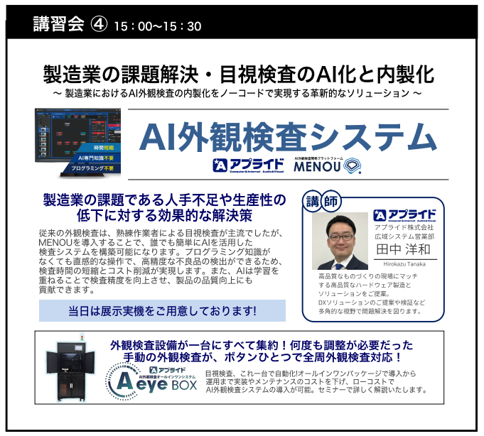 【内容】: 製造業の課題である人手不足や生産性の低下に対し、プログラミングやAIの専門知識がなくても誰でも簡単にAI外観検査を内製化できる革新的なソリューション(A eye BOX, MENOU)を解説します。