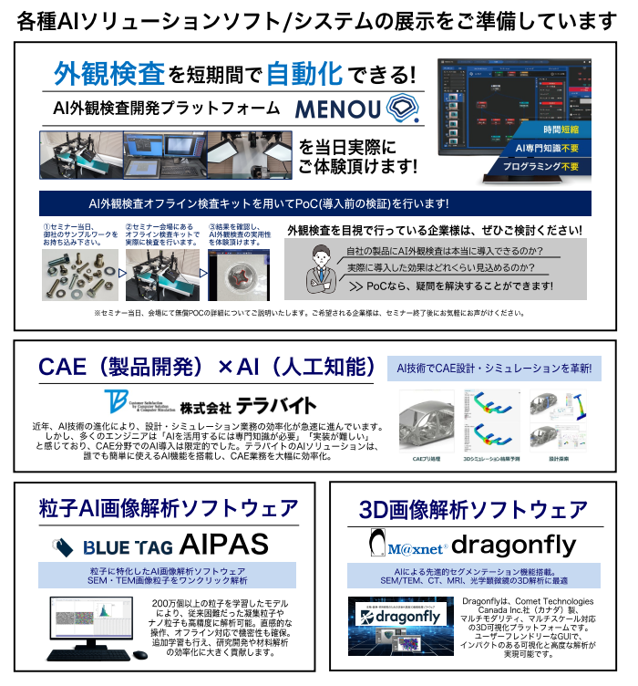 - 『アプライドAI外観検査システム』: プログラミング・AI専門知識不要でAI外観検査を内製化できるプラットフォーム。 会場ではサンプル持ち込みによる無償PoCも体験可能です。