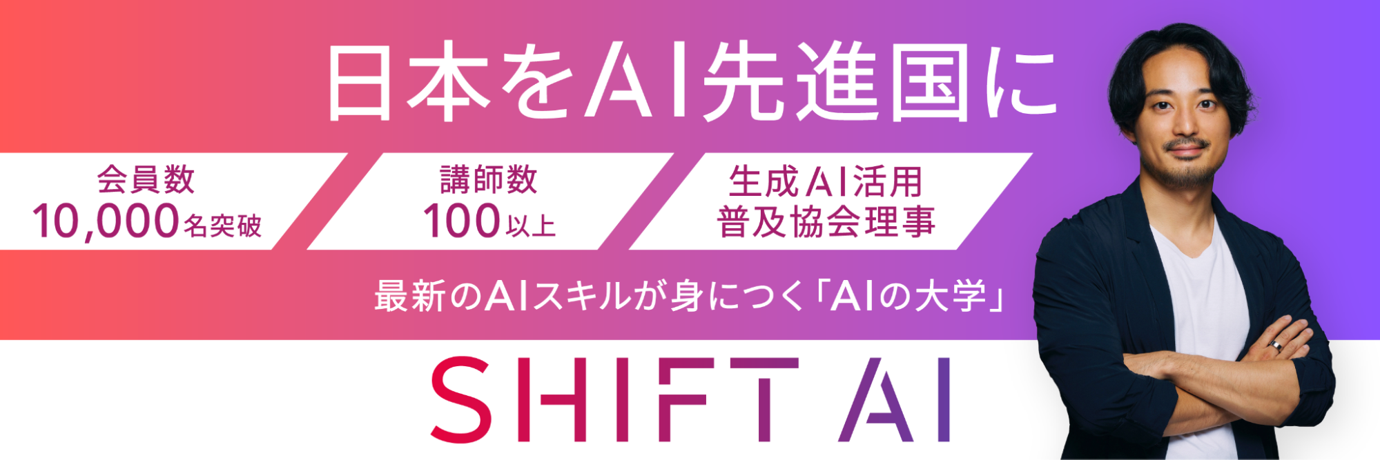 株式会社SHIFT AIは、「日本をAI先進国に」というビジョンのもと、生成AIをはじめとするAI技術のビジネス活用を学べる、利用者数No.1※の生成AI学習コミュニティ「SHIFT AI」を運営しています。会員数は1万6,000人を超え、法人向けのリスキリング支援サービス「SHIFT AI for Biz」や、教育機関向けの「SHIFT AI for School」など、幅広い分野でAI人材の育成を推進。さらに、独自メディア「SHIFT AI Times」の運営をはじめ、情報発信・研修・イベントを通じて、個人と組織の成長を支援し、日本全体のAI活用を加速させています。