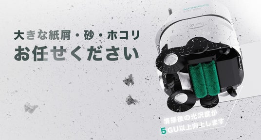 「掃き」「拭き」「吸引」「ダストプッシュ」の4つの機能を1台に統合。水や洗剤を一切使用せず、高効率で床面を清掃し、常に美しい状態を維持します。