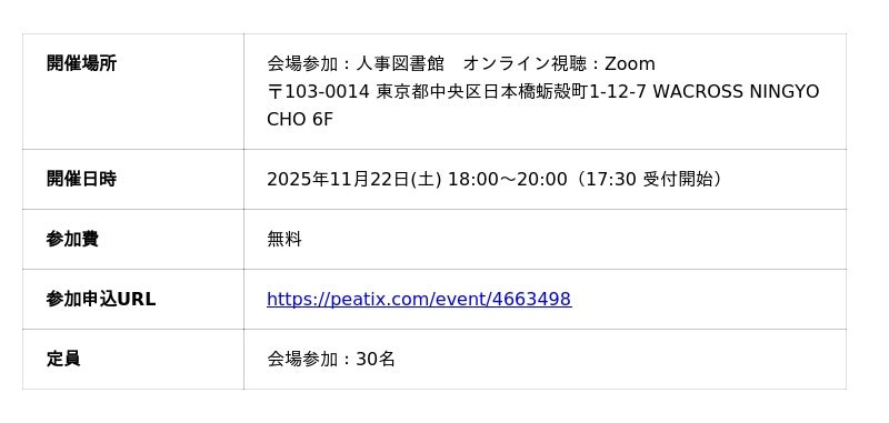 株式会社Trustyyle(本社:東京都中央区・代表取締役:吉田洋介)は、運営するコミュニティ「人事図書館」にて、2025年11月22日(土)に「『図解採用入門』『人事のプロはこう動く』出版合同イベント!」を開催します。