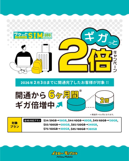 イエローモバイルは今回、オーストラリア向けSIMカード『サクっとSIM 【AUS】 for iPhone』の対象プランを価格そのままでデータ増量に伴い、さらに『ギガっと2倍キャンペーン』を開始しました。