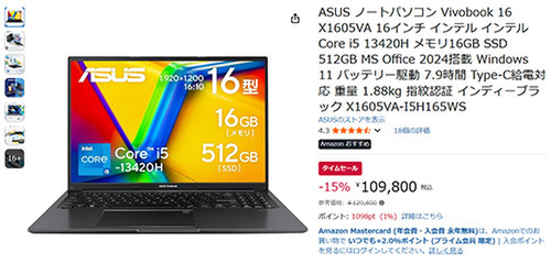 高性能ノートが15%オフ! ASUS Vivobook 16(Core i5/Office 2024搭載)が109,800円