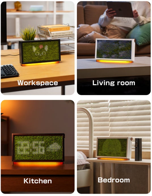 Moss Echoは、Light Poleテクノロジーを活用し、苔の表面にさまざまなコンテンツを直接映し出す特別な機能を備えています。自然の風景、時計機能、ナチュラルアラーム、オーディオビジュアライザー、スリープモードなど、多彩なコンテンツ切り替え機能とカスタマイズデザインにより、Moss Echoを自分の好みに合わせて設定し、暮らしの空間をより豊かに演出することができます。