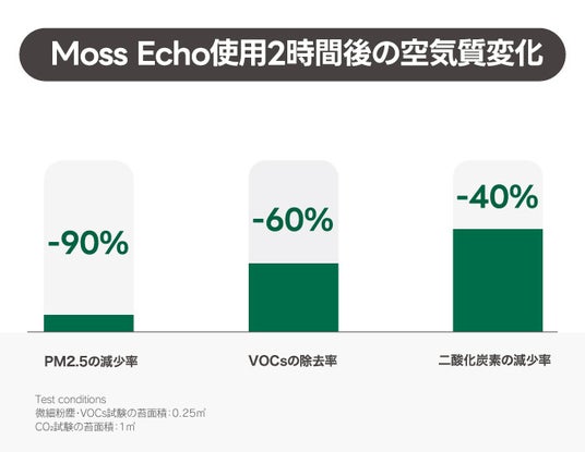 Moss Echoは、CO2およびVOCに関する室内空気環境テストを実施し、快適な空気環境を保つサポート効果が確認されました。自然素材と光のテクノロジーが調和し、空気も心も澄みわたる空間を生み出します。