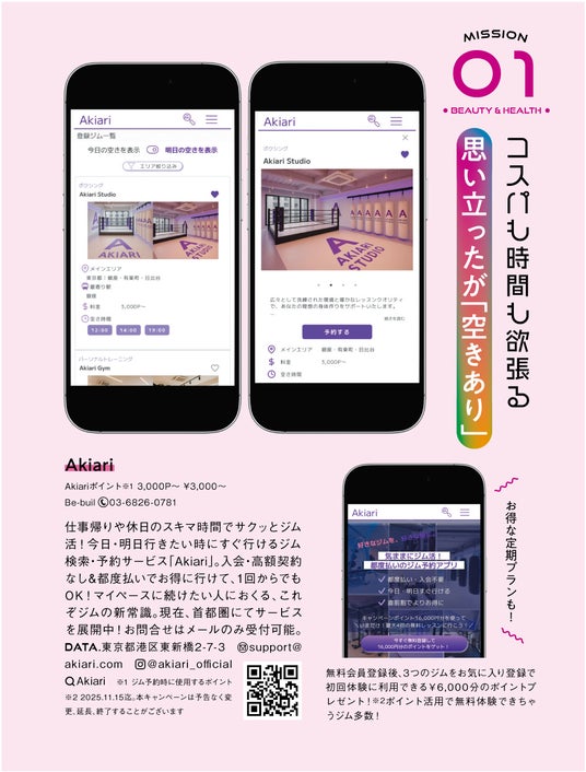 2025年10月15日発売の『トレンド大賞2025』特集号に掲載されました。本特集では、2025年に誕生した多様なトレンドや次に注目されるサービスを取り上げています。同特集にあわせて、「TREND MISSION FOR 2025⇒2026」と題した企画も実施され、2026年に向けたライフスタイルの変化や新しい価値観を提案。その中でAkiariは、当日・翌日の予約に特化した新しいスタイルのジム予約サービスとして紹介されています。