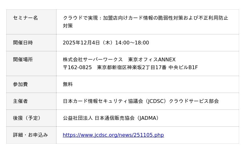 株式会社YTGATE(本社:東京都中央区、代表取締役:高橋祐太郎、以下「YTGATE」)は、2025年12月4日(木)、日本カード情報セキュリティ協議会(以下、「JCDSC」)が主催するセミナー『クラウドで実現:加盟店向けカード情報の脆弱性対策および不正利用防止対策』に、代表・高橋が登壇することをお知らせいたします。