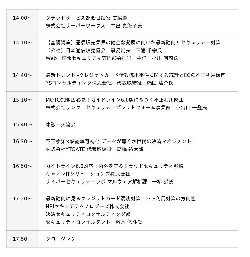 ※ 本セミナーは、クレジットカード情報の脆弱性対策および不正利用防止など、クレジットカードセキュリティ対策に関心のある加盟店を主な対象としております。恐れ入りますが、主催者の判断により、対象外の方、または同業他社・競合企業にあたると判断される場合には、お申込みをお断りさせていただくことがございますので、あらかじめご了承ください。