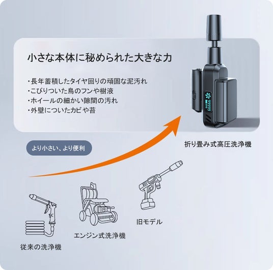 手のひらサイズで1MPaの高圧を実現。車洗浄や家庭清掃に対応し、1秒折りたたみ収納&5種ノズル切替可能。アルミフィルター搭載で塗装保護、アウトドアでも安心使用。