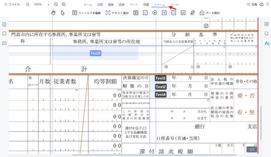 テキストフィールド、チェックボックス、ドロップダウン、署名欄などを自由に配置でき、