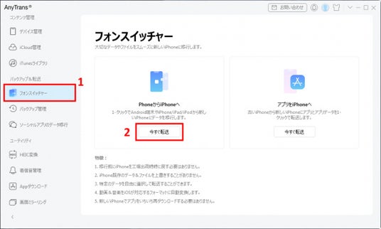 AnyTransは、iPhone・iPad・iPodなどのiOSデバイス向けに設計された、データ転送・管理・バックアップを一括で行える多機能ソフトです。iOS間のデータ移行はもちろん、AndroidからiPhoneへのデータ転送にも対応しており、機種変更時のコンテンツ移行を手軽に行うことができます。写真、音楽、動画、連絡先、メッセージ、LINEなど、さまざまなデータを柔軟に管理・整理でき、iCloudやiTunesの制限にとらわれず、より自由で快適なデータ運用をサポートします。
