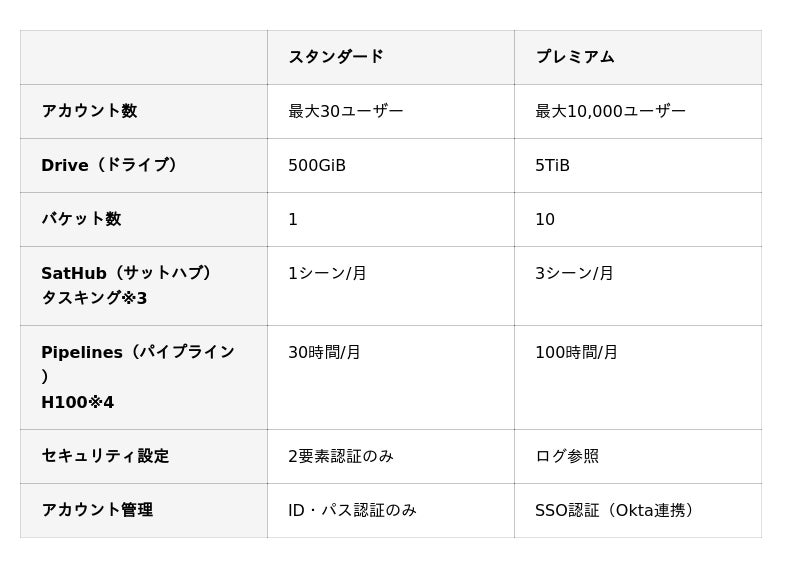 「スタンダード」と「プレミアム」の2プランをご用意しています。また、「Drive(ドライブ)」や「SatHub(サットハブ)」など、一部機能のみのご利用についても個別にご相談を承ります。