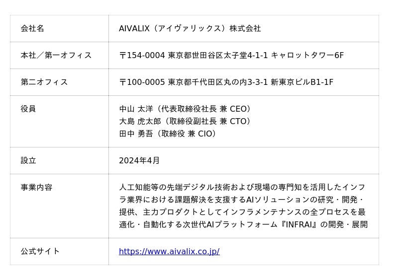 AIVALIXは、AI技術と現場の知見を掛け合わせ、レジリエンスに満ちた次世代の社会インフラを築くことを使命としています。