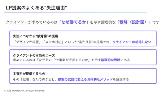 本資料では、「なぜそのLPで成果が出るのか」を論理的に示すためのAI分析の活用方法を解説。従来の“感覚的な提案”から脱却し、競合比較やサイト構成の勝ち筋をデータで導く「AI×マーケター」による次世代の提案メソッドを紹介しています。