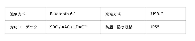 - 長時間再生と便利なスマートな機能:イヤホン単体で最大7時間、付属の充電ケースと合わせると最大30時間の音楽再生が可能(※ ノイズキャンセリングOFFの場合)です。ハイレゾ再生が可能なLDAC(TM)に対応し、従来コーデックと比較して3倍の情報量を伝送できるため、原音に忠実に音楽を再現します(※ Bluetooth A2DPのSBC(328kbps, 44.1kHz時))。さらにマルチポイント接続やIP55の防塵・防水規格に対応し、雨や汗にも強く、日常のあらゆるシーンで活躍します。さらに4つのマイクとAIノイズ低減機能により、通話相手にクリアな音声を届けます。