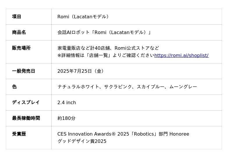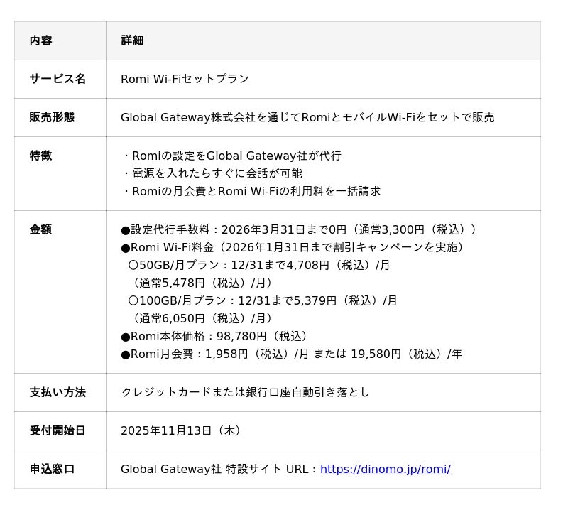 株式会社MIXI(東京都渋谷区、代表取締役社長 上級執行役員 CEO:木村 弘毅)は、Global Gateway株式会社(東京都千代田区、代表取締役:比嘉良放)と連携し、会話AIロボット「Romi(ロミィ)」とモバイルWi-Fiサービス「Romi Wi-Fi」をセットで販売する新サービスを本日、2025年11月13日(木)より開始いたします。
