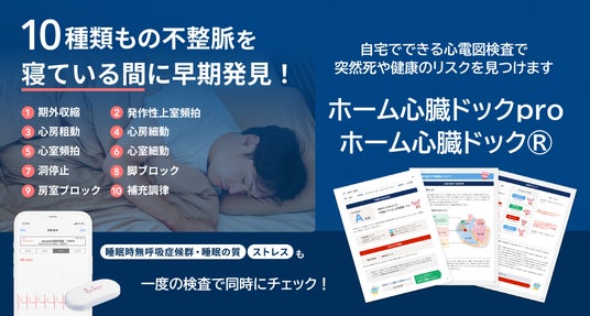 胸部に小型心電計を貼り付け寝ている間に不整脈、睡眠時無呼吸症候群(SAS)や睡眠の質、ストレス兆候を測定する病院レベルの心電図検査「ホーム心臓ドックpro」。