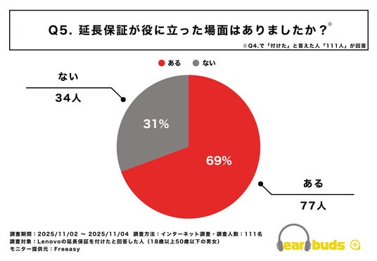 Q5:延長保証が役に立った場面はありましたか?(Q4で「付けた」n=111)