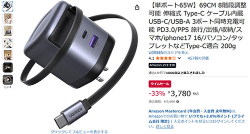 65Wの高出力とUSB-Cケーブル内蔵を両立し、出張や旅行にぴったりの一本。過去価格5,680円のところ、33%OFFの3,780円という4,000円を切るお買い得価格で手に入ります。