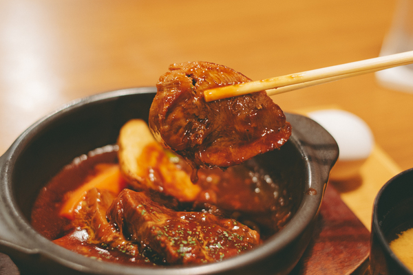 運ばれてきた土鍋からはグツグツと煮立つ音と共に湯気が立ち上り、デミグラスソースの香りがふわり。とろみを帯びたソースの中から、かなり厚切りのごろっとした牛タンが姿を現します。何時間もかけてじっくり煮込まれてた牛タンは、箸でそっと持ち上げただけでほろっと崩れるほど柔らかく、「これ、本当に1,200円で食べていいの?」と思わず心の中でつぶやいてしまうレベル。
