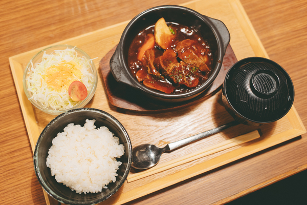 口に運んだ瞬間、牛タンは舌の上でスッとほどけていくよう。まさに「歯がいらない」という表現がぴったりの、ほろりと崩れる柔らかさです。濃厚なシチューのコクと合わさったその味わいに、思わず小さくため息がこぼれます。特製のビーフシチューソースは赤味噌を隠し味に加えたオリジナル仕立てで、コク深いのに後味はどこか爽やか。野菜の甘みも溶け込んだ濃厚なソースが白いご飯に絡んで、気づけばお箸が止まりません。