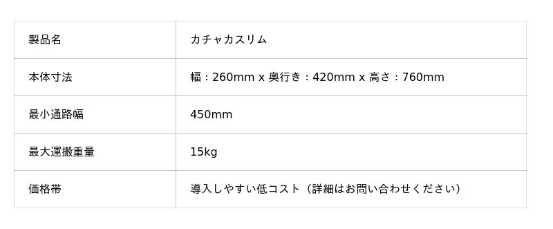 こうした現場の声に応える形で誕生したのが、最小通路幅450mmを実現した「カチャカスリム」です。