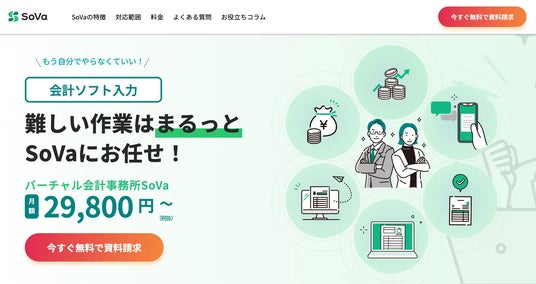 「SoVa」は、月額29,800円~で、役所手続きの代行から記帳代行・給与計算、経営者へのアドバイスまでをワンストップで提供する、新しいかたちの会計事務所です。