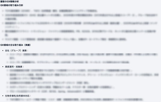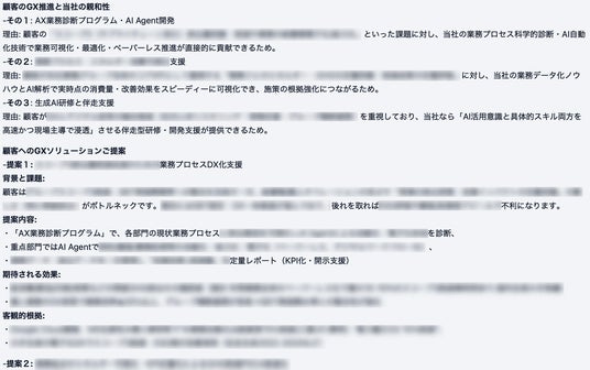 - GX(グリーン・トランスフォーメーション)特化型AI:すでにGX領域の営業に特化したデモ開発が完了しています。例えば、GX関連の特定情報ソース(例:関連省庁のドキュメント、業界レポート)を優先的に読み込ませ、GXの文脈に沿った課題特定とソリューション提案を自動生成させるといった、専門性の高いカスタマイズが可能です。