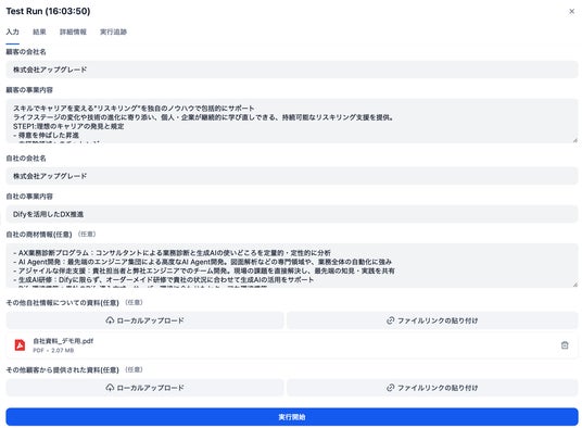 顧客の会社名を入力するだけで、AIエージェントがGoogle SearchやWebスクレイピングを活用し、顧客の最新プレスリリース、ニュース、市場動向、競合他社の動向などをリアルタイムで収集・分析を実行します。手作業のリサーチ工数を劇的に削減し、常に最新の状況に基づいた戦略立案を可能にします。(リサーチのトピックを指定するようなカスタマイズも可能です。)