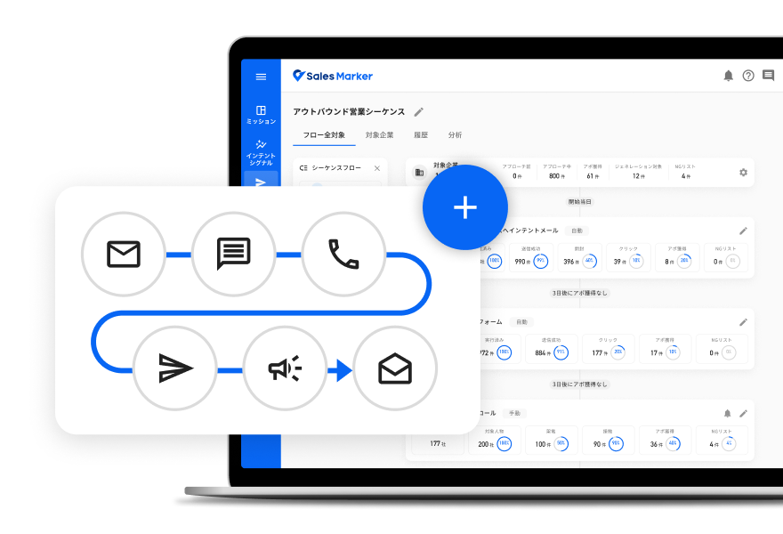 メール・コール・SNS・広告などSales Markerに実装された複数のチャネルを自由に組み合わせ、順番やタイミング(日数やアクション指定)を細かく設定可能。