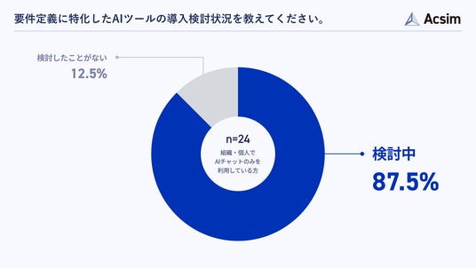 要件定義に特化したAIツールの導入検討状況について尋ねたところ、「検討中」が87.5%、「検討したことがない」が12.5%でした(n=24/組織・個人でAIチャットのみを利用している方)。
