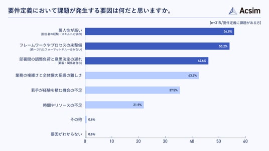 要件定義における課題が発生する要因について尋ねたところ、「属人性が高い(担当者の経験・スキルへの依存)」が56.8%で最も多く、「フレームワークやプロセスの未整備」が55.2%、「部署間の調整負荷と意思決定の遅れ」が47.6%と続きました(n=315/要件定義に課題がある方)。