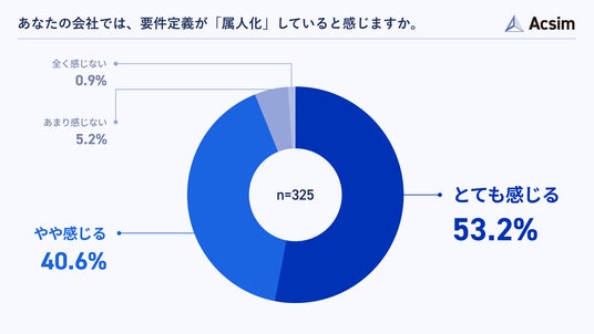 自社プロジェクトの要件定義が属人化していると思うか尋ねたところ、「とても感じる」が53.2%、「やや感じる」が40.6%で、合わせて93.8%が属人化を実感していることがわかりました(n=325)。