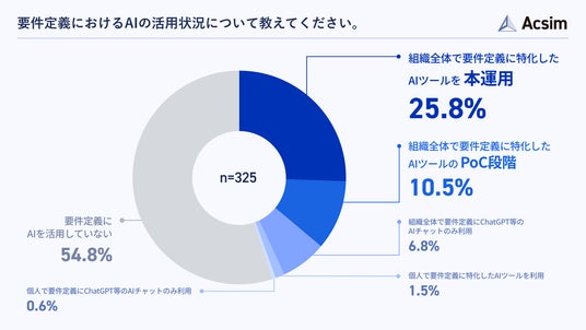 要件定義におけるAIの活用状況について尋ねたところ、「組織全体で要件定義に特化したAIツールを本運用」が25.8%、「組織全体でPoC段階」が10.5%、「組織全体でChatGPT等のAIチャットのみ利用」が6.8%でした(n=325)。
