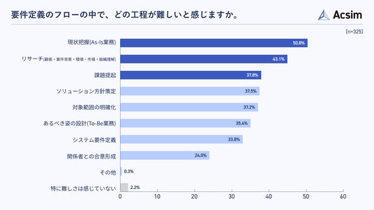 要件定義フローの中で難しいと感じる工程を尋ねたところ、「現状把握(As-Is業務)」が50.8%で最も多く、「リサーチ」が43.1%、「課題提起」が37.8%と続きました(n=325)。