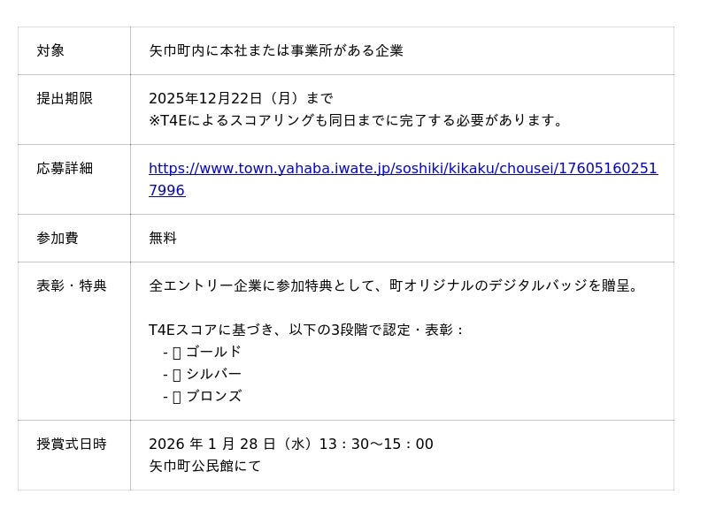 また、エントリー企業には参加特典として矢巾町オリジナルのデジタルバッジが贈呈され、表彰企業は町のホームページ等で紹介される予定です。(昨年の受賞企業はこちら。)