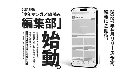 株式会社ソラジマ(代表取締役:萩原鼓十郎・前田儒郎、所在地:東京都港区芝浦一丁目12番3号、以下「ソラジマ」)は、オリジナルの少年マンガ×縦読みに特化した漫画アプリを、2027年春にリリースすることが決定しました。同アプリの専属編集部を立ち上げ、2027年春の公開に向けて多数の縦読み(Webtoon)形式の少年マンガを鋭意制作中です。