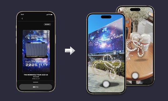 本企画のLIVE CARDは、コンサートのステージセットをデジタル3Dで再現しており、お客様ご自身のスマートフォンで360°自由に動かし、細部までご鑑賞いただけます。 (ご利用には、端末アプリ「YOIN WALLET」のダウンロードが必要です。)
