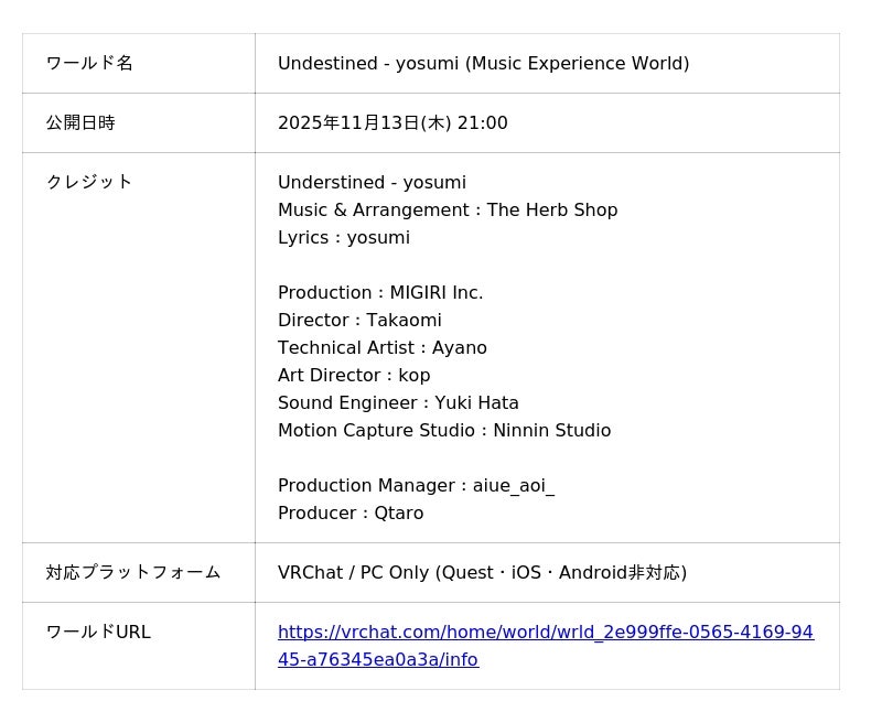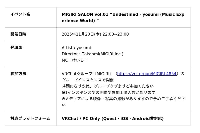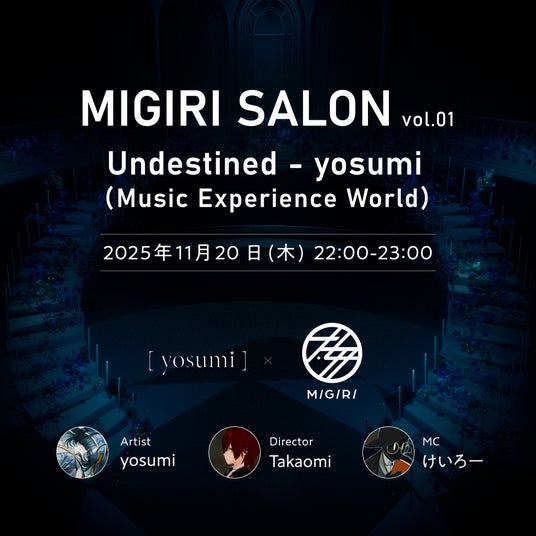 また、11月20日(木)の22:00よりyosumiとTakaomi(MIGIRI Inc.)による制作裏話トークイベント「MIGIRI SALON vol.01 “Undestined - yosumi (Music Experience World) “」を実施いたします。MIGIRIのVRChatグループのグループインスタンスで開催します。参加を希望される方はグループに参加をお願いします。なお、インスタンスはひとつで行うため参加上限人数がございます。