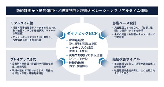 Ridgelinez株式会社(以下Ridgelinez)は、事業継続計画(以下BCP)(※1)を静的な文書から、組織やリスク環境の変化に動的に対応できるBCP/BCM(※2)へ刷新する新サービス「Dynamic BCP(ダイナミックBCP)構築サービス」の提供を開始します。