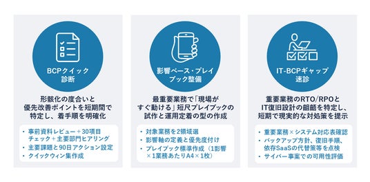 Ridgelinezでは、1か月程度で着手可能なクイックに提供できる「BCPクイック診断」「影響ベース・プレイブック整備」「IT-BCPギャップ速診」といった個別のコンサルティングサービスもご用意しています。