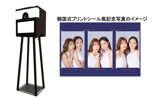 省スペースで設置可能な撮影システムで、施設やイベントの世界観に合わせたオリジナルのテンプレートで写真撮影ができます。本展示会場では、3枚の異なるカットを撮影し、ミシン目入りの用紙にプリント。近年Z世代を中心に人気の“韓国式プリントシール風”の記念写真が楽しめます。さらに、撮影画像はすぐにダウンロードでき、その場でSNSなどにシェア可能です。