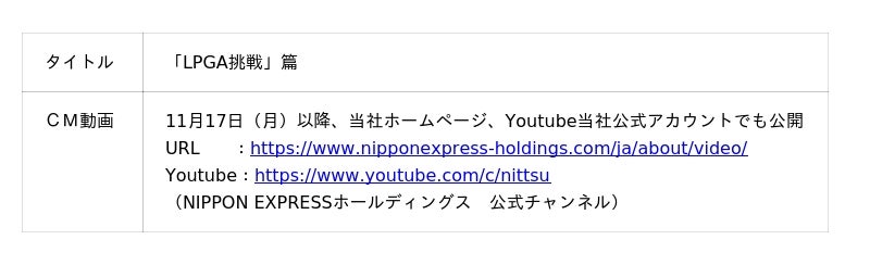 NIPPON EXPRESSホールディングス(社長:堀切智)は、当社所属の女子プロゴルファー・原英莉花選手(以下、原プロ)を起用した新テレビコマーシャル、原英莉花プロ 「LPGA*挑戦篇」の放映を11月15日(土)から開始します。
