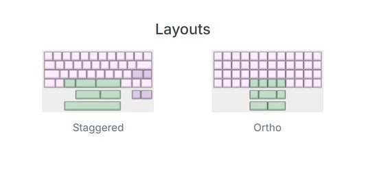 - 2種類の配列構成 スタッガード配列/オーソリニア配列の2種類のレイアウトから選択でき、ユーザーの好みや使用スタイルに合わせて柔軟に構成できます。スタッガード配列のスペースキーは1.25u+2.25u+2.75uまたは、6.25uの構成が可能です。