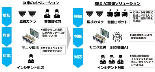 ※1 SBX 警備 AI:自己学習型AIが監視カメラのデータを自動学習し、AI警備員としてインシデントの兆候を検知する
