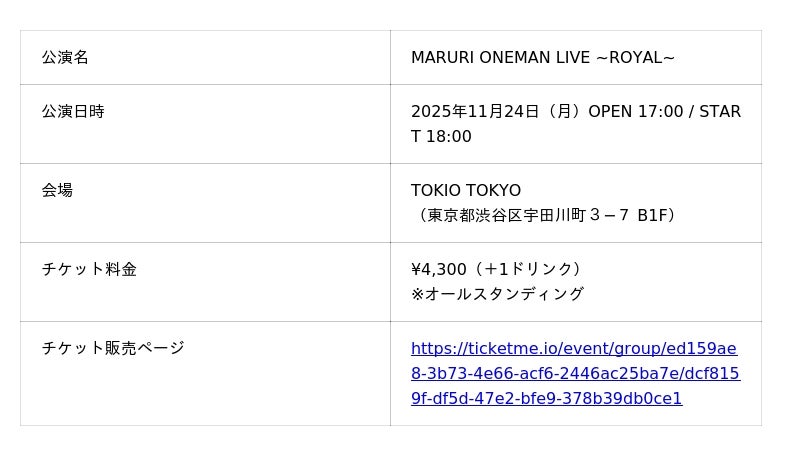 株式会社チケミー(本社:東京都港区、代表取締役:宮下大佑)が運営する電子チケットプラットフォーム「TicketMe(チケミー)」は、Z世代を中心に圧倒的な支持を集める女性シンガー・まるりのワンマンライブ「MARURI ONEMAN LIVE ~ROYAL~」のチケットを発売中です。
