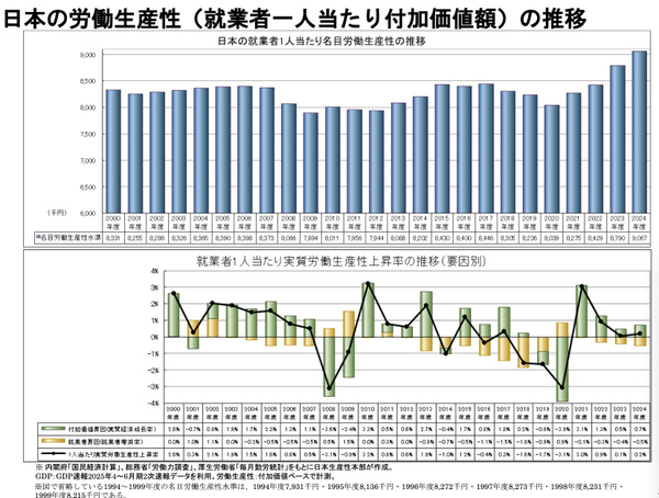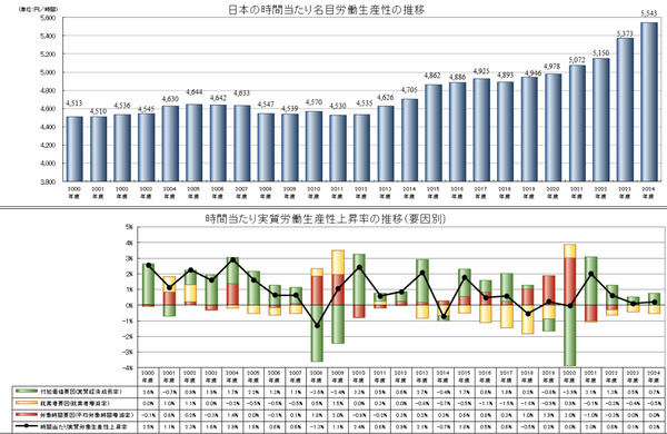 ・2024年度の日本の労働生産性、名目は5543円/時間で1994年度以降の最高水準